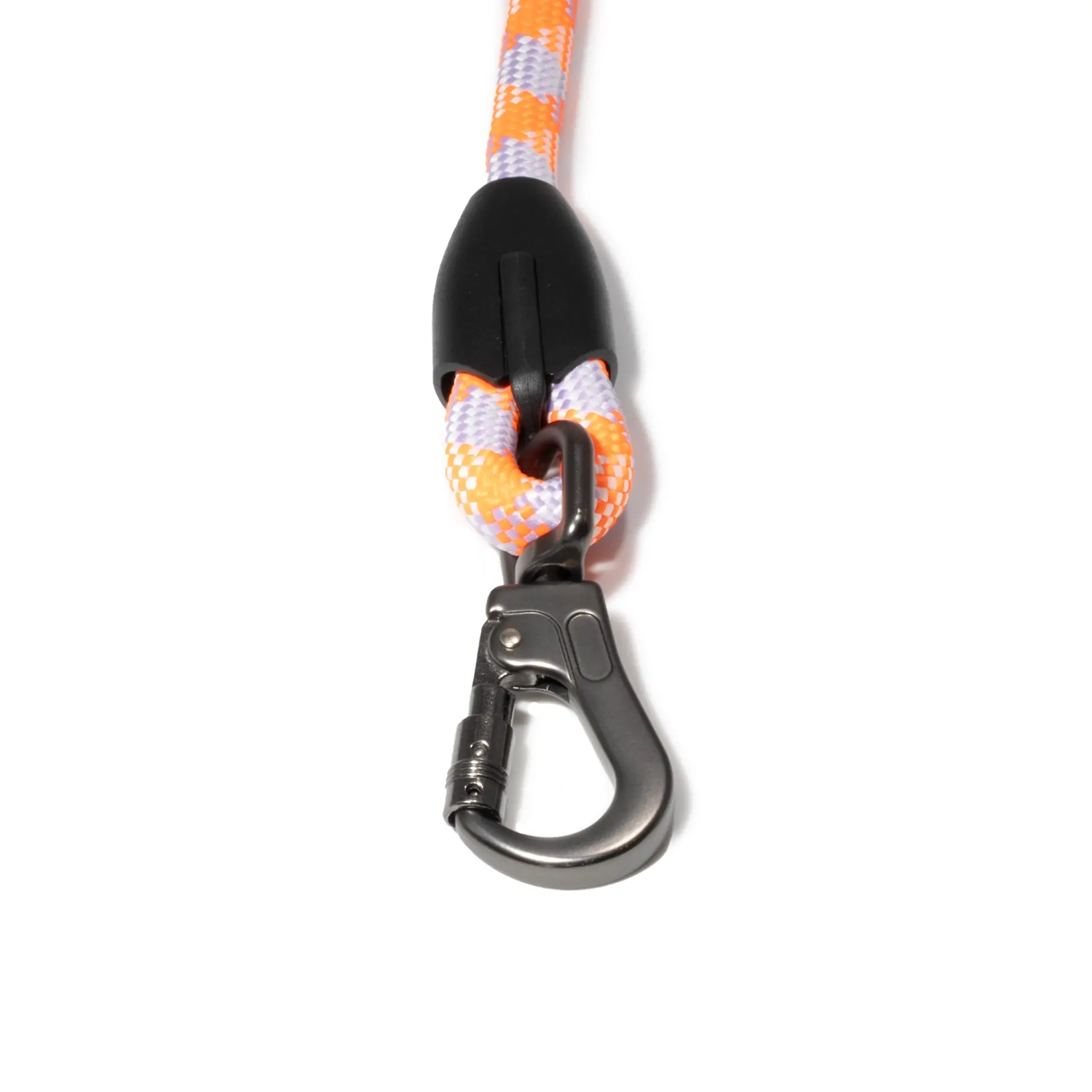 O mosquetão usado nessa guia não é qualquer fecho — ele é um mosquetão com trava giratória, feito em metal resistente e projetado para suportar movimentos bruscos. A trava de segurança impede que o cão se solte acidentalmente, mesmo em situações inesperadas.